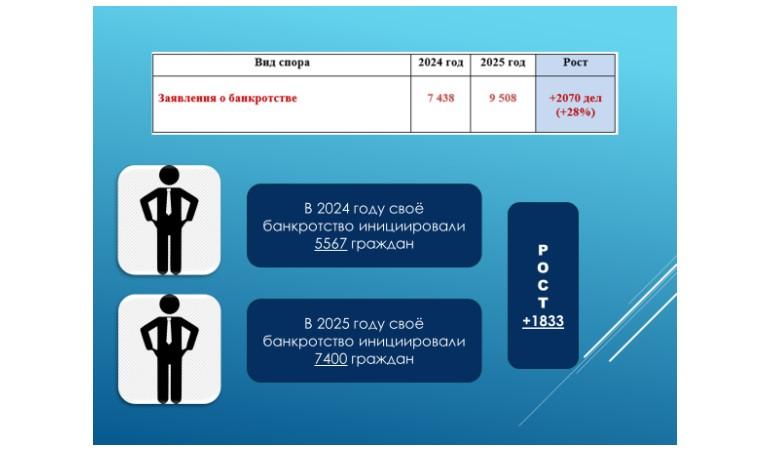 Прирост произошёл исключительно за счёт физических лиц. Количество заявлений от граждан увеличилось на 32,5%, достигнув 2147. Теперь на долю физлиц приходится 92% всех банкротств, причём в 96% случаев процедуру инициировали сами должники.