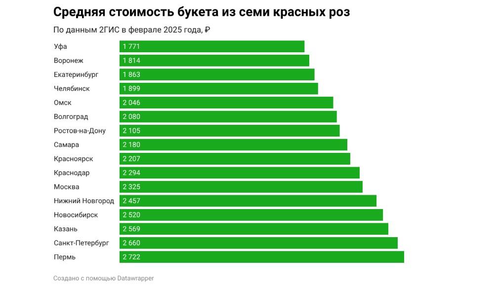 Самыми доступными цветы оказались в Уфе — всего 1 771 рубль за букет из семи роз.
