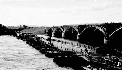 Ещё одна архивная подпись гласит: «Понтонный и Коммунальный мосты. Понтонная переправа действовала с 1942 по 1961 года. Разводилась с двух часов ночи до шести часов утра для прохода судов. Коммунальный на завершающем этапе строительства».