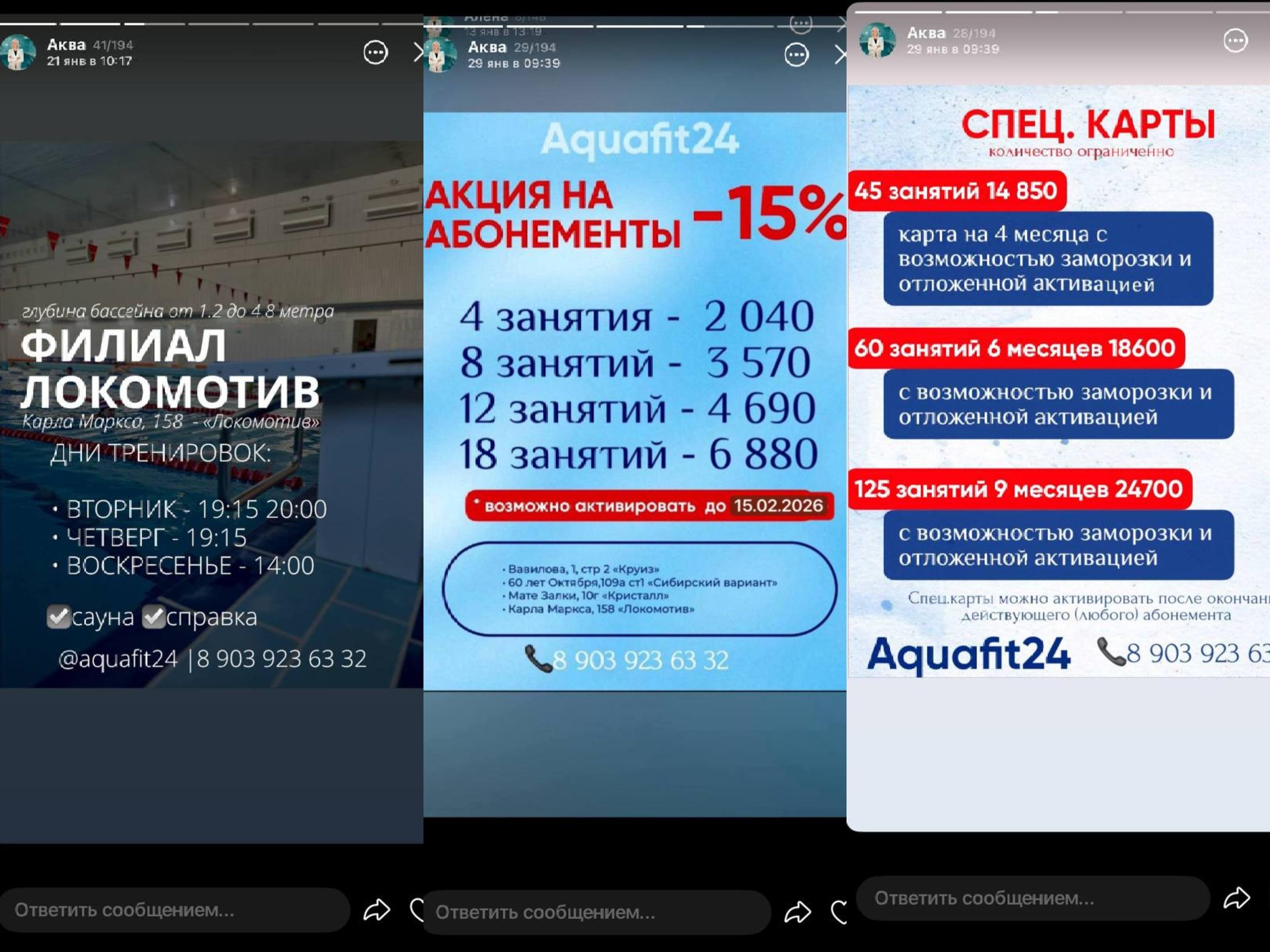 При этом с ноября по январь в мессенджерах рассылались спецпредложения со скидками. Абонементы предлагались по сниженным ценам — от 2 тысяч рублей за четыре занятия до 21 800 рублей за 125 занятий.