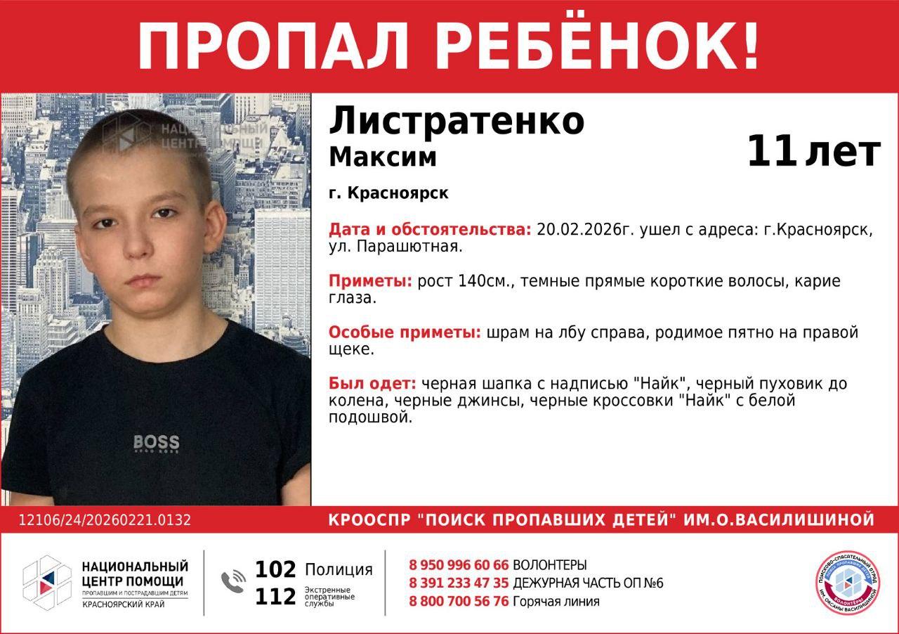 Поисково-спасательный отряд имени Оксаны Василишиной сообщает о пропаже одиннадцатилетнего Максима Листратенко. 20 февраля он ушел из школы, но домой так и не пришел. Ночевать мальчик также не возвращался. Семья недавно переехала в Красноярск, поэтому ребенок плохо ориентируется в городе. Ранее он никогда не уходил из дома без ведома родных.