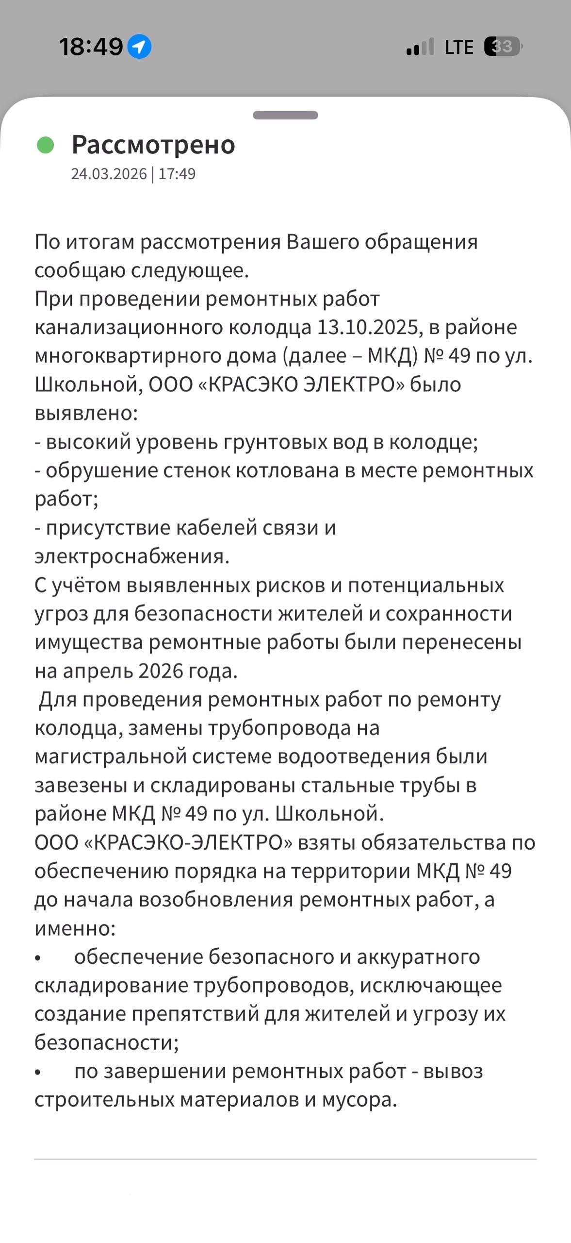 Согласно ответу на обращение через «Госуслуги», проблемы на этом участке начались в октябре 2025 года. Подрядчик ООО «Красэко Электро» при ремонте канализационного колодца обнаружил высокий уровень грунтовых вод, обрушение стенок котлована и наличие кабелей связи и электроснабжения. Ремонтные работы были перенесены на апрель 2026 года.