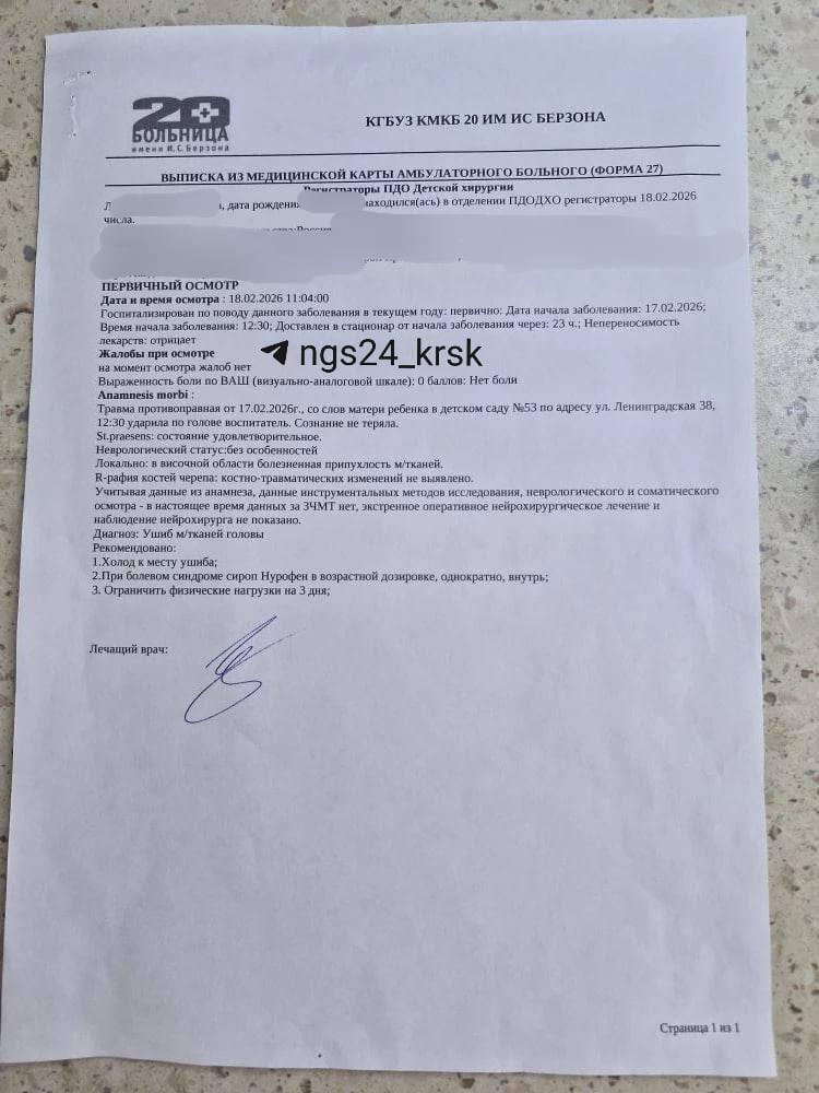Мать шестилетней девочки заявила, что в ведомственном детском саду №53 Красноярска младший воспитатель ударил ребенка кулаком по голове, из-за чего девочка упала лицом в тарелку с супом. У ребенка диагностировали ушиб мягких тканей головы, а мать обратилась в полицию, Следственный комитет и прокуратуру.