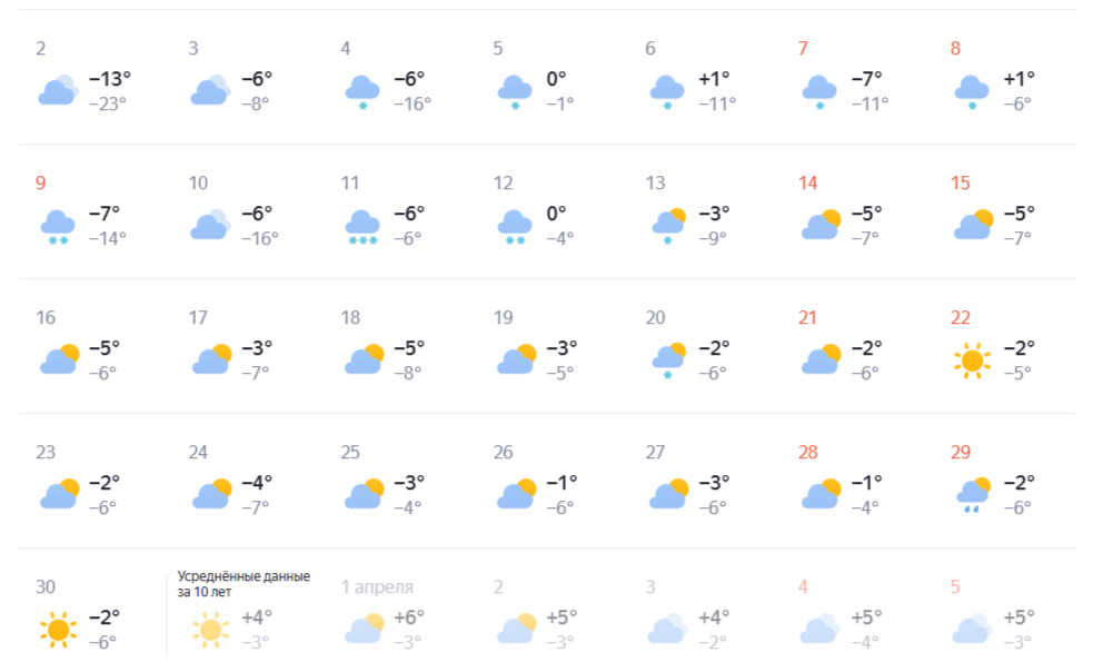 На сайте Gismeteo.ru картина в целом схожа. Во второй половине марта температура в основном будет держаться около -1 градуса. Единственный полностью солнечный день прогнозируется на 19 марта. При этом осадков ожидается больше: снег, иногда мокрый, будет идти часто, включая конец месяца.