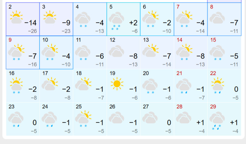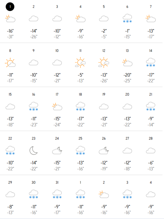 Агрегатор AccuWeather.com даёт более суровый прогноз. Март ожидается очень холодным, с ночными температурами до -24 градусов. Зато солнечных дней здесь больше — как минимум три в самом начале месяца. Дождь в этом сценарии не упоминается, а самая низкая дневная температура составит -20 градусов.