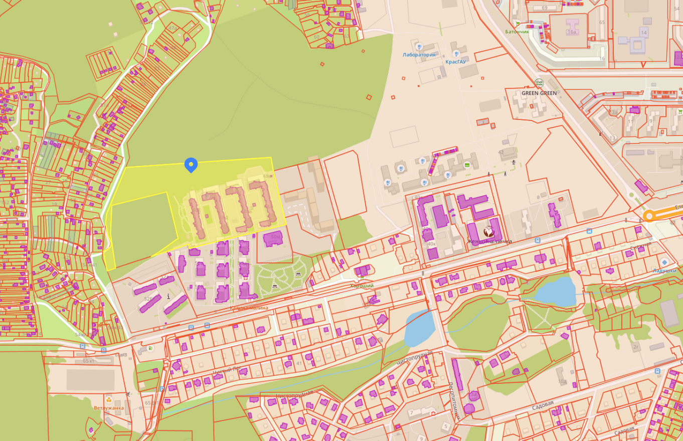Жёлтым обозначен ЖК «Плодово-Ягодный», ниже — «Лесной массив», справа — строящийся «Вита-парк».